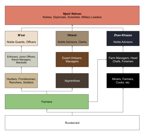 There were exceptions to the rule. Disowned Njarir often found themselves cast down into the peasantry, or into the Ruvska’ard depending on the severity of their transgression. Additionally, farming was hard work without the mechanization of modern Adhomai. As such, any of the lesser castes could find work tilling the fields. The rise of the new armies in the gunpowder era led to the increased recruitment of other races aside from Njarir’Akhran and M’sai in armed forces across Adhomai breaking the grip M’sai had over the war-making of Adhomai. | |||